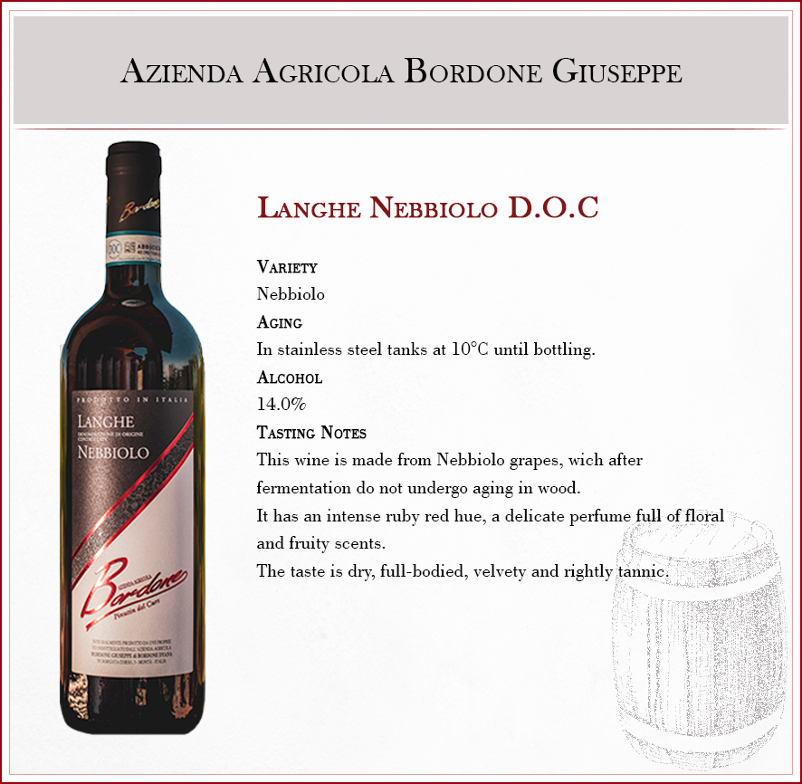 Bordone Giuseppe’s winery is located in Piedmont, in the North West of Italy, in a small town called Monta’, which lays in an area known as Roero. Its name comes from an ancient lineage of earls and the landscape here appears as a wide stretch of hills, called Rocche. The terrain here has a peculiar colour, ranging from yellow to ochre, due to the presence of sand and sea fossils, which can still be found in the soil today. This land has always been voted to wine cultivation and, as a matter of fact, there are documents which state the presence of the Arneis grape variety at the beginning of the XIV century, as well as Nebbiolo, which dates back to the end of the 400s.